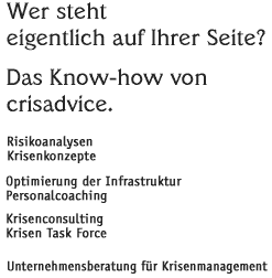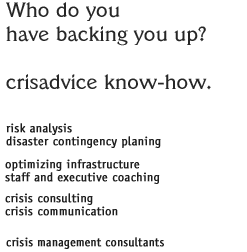 + + + Erfolgreiche Kooperation im zehnten Jahr: crisadvice und PRGS werden ADVICE PARTNERS + + + NEU: Grundlagenwerk >Krisenkommunikation< völlig überarbeitete Neuauflage 2014 jetzt im Buchhandel